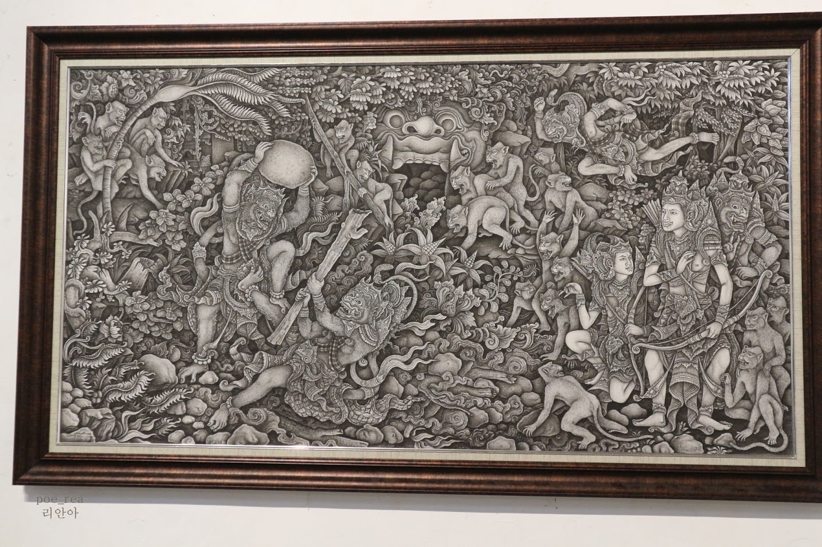 I wonder how a painter can paint like this. It's really complicated painting. The painting is really deatailed and many shape was paint there. I amazed by this paint. The painting tell the story about a war between brothers Subali and Sugriwa.